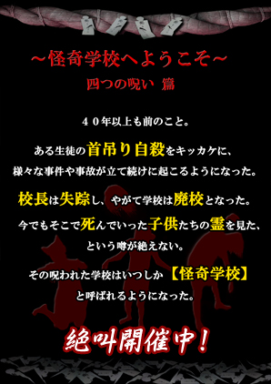 本ページは、予告無く変更する場合があります。現場優先とさせて頂きます。ホラーアトラクションにつき、また当校の諸事情により、大変申し訳ありませんが、ご入学になれない場合があります事をご了承の上、お越し下さい。